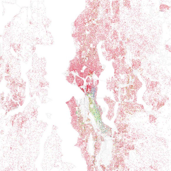 For their final project they have to interview a native Mexican, who speaks Spanish. It’s just a crazy project for so many reasons. A Mexican? We live in Seattle. The photo above is an aerial map of Seattle. Red dots represent where all the white people live. Orange dots represent Hispanics. Where are we going to find a Mexican?